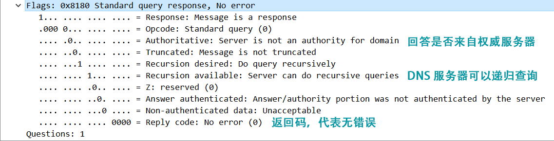具有一系列标志,说明该 DNS 数据报 的特征。其中包含是请求还是回答、是否递归、回答是否来自权威服务器等。共 2 Bytes。